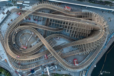 A striking aerial view of the Leviathan wooden roller coaster at Seaworld under construction, revealing a maze of timber supports, curved track sections, and machinery, —showcasing the scale and intricate craftsmanship from above.