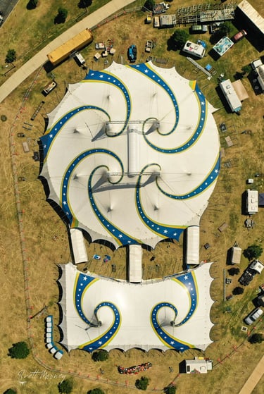 A perfectly centered aerial view of the large Circus Rio tent with flowing blue and yellow star patterns across the white canopy. Surrounding caravans, equipment, and pathways highlight the vibrant setup and scale from above.